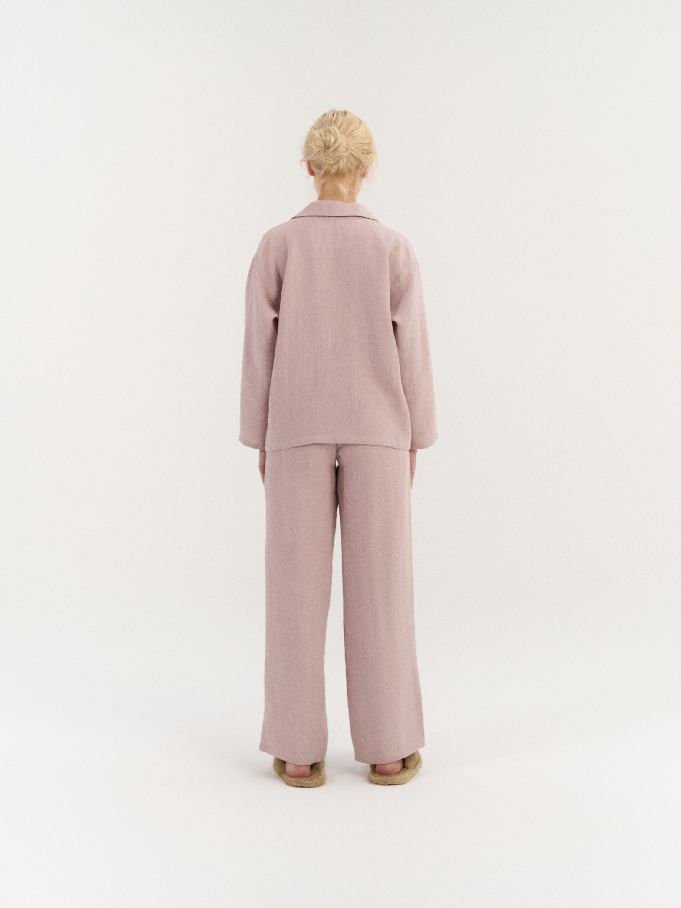 A relaxed two-piece linen pajama set designed for everyday comfort. The shirt features a button-down front with a simple collar and two front pockets, offering a practical, easy-to-wear shape. The matching pants are finished with an elastic waistband and adjustable drawstring, with a smooth, pocket-free design for a clean, uncomplicated fit.