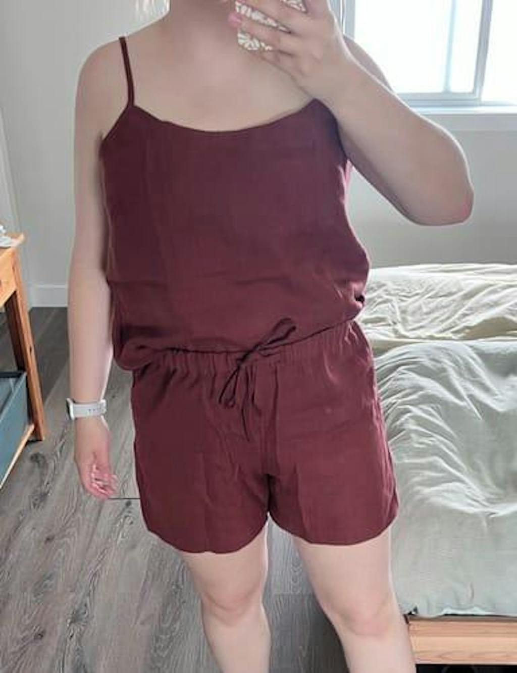 Léger et confortable, il invite à ralentir. Le top sans manches s’associe à un short à taille élastiquée avec cordon, à la ligne nette et sans poches.