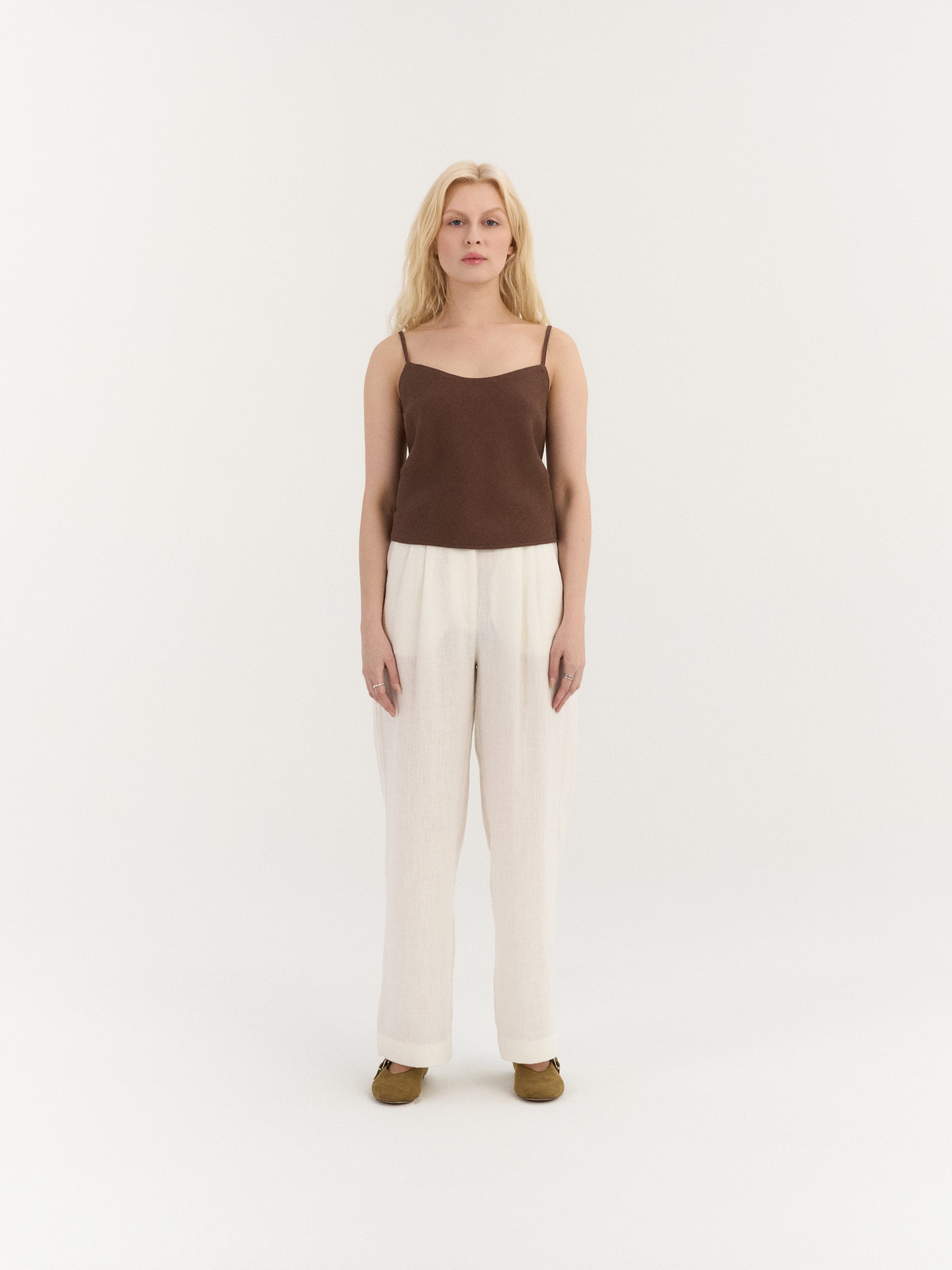 Sleeveless top with a straight neckline and slim shoulder straps. The front features a clean, minimal silhouette, while the back is designed with crossed straps and an open back detail with adjustable lace-up ties. The lace-up closure allows for an adjustable fit at the back. Finished with a straight hem.