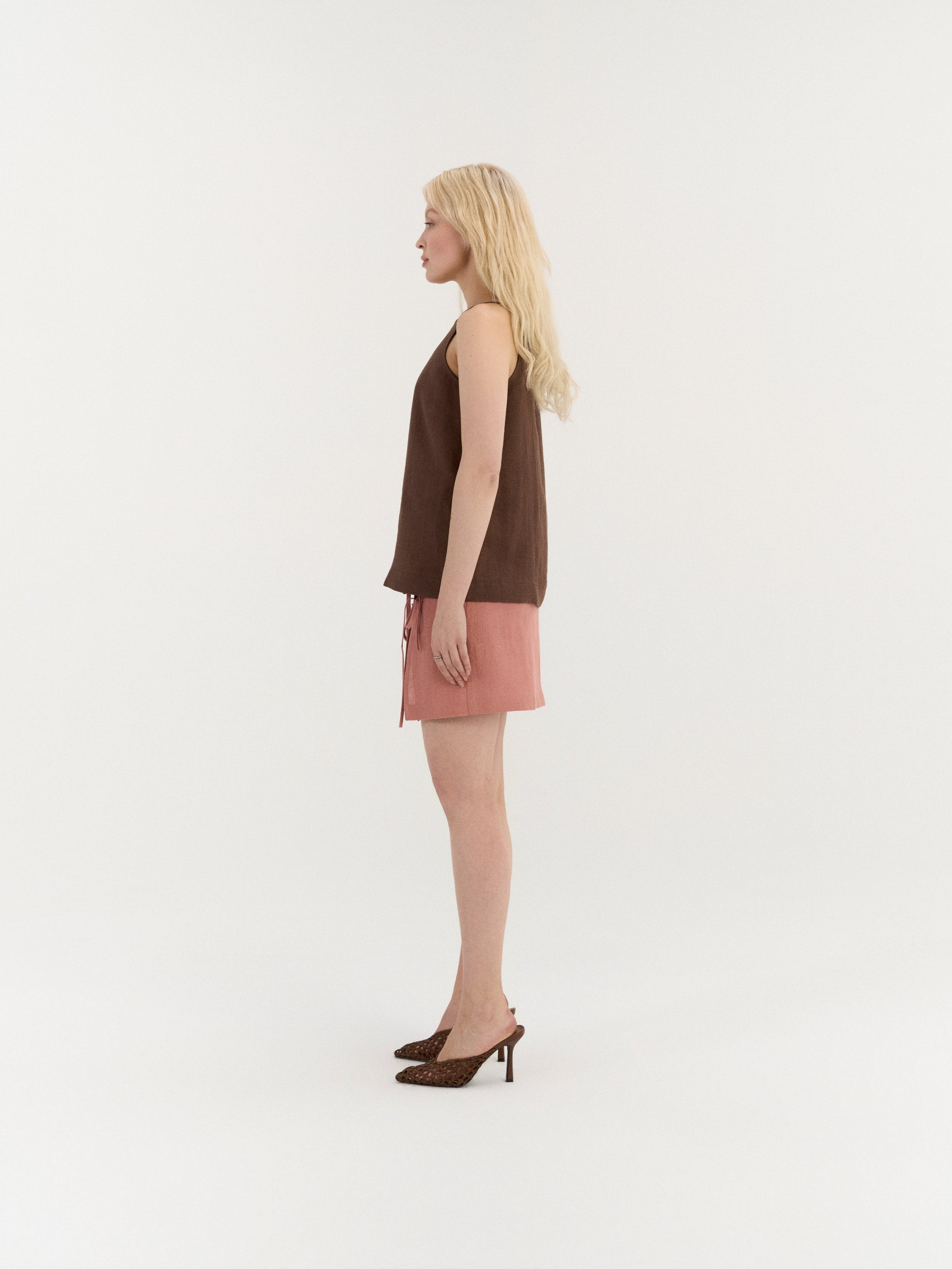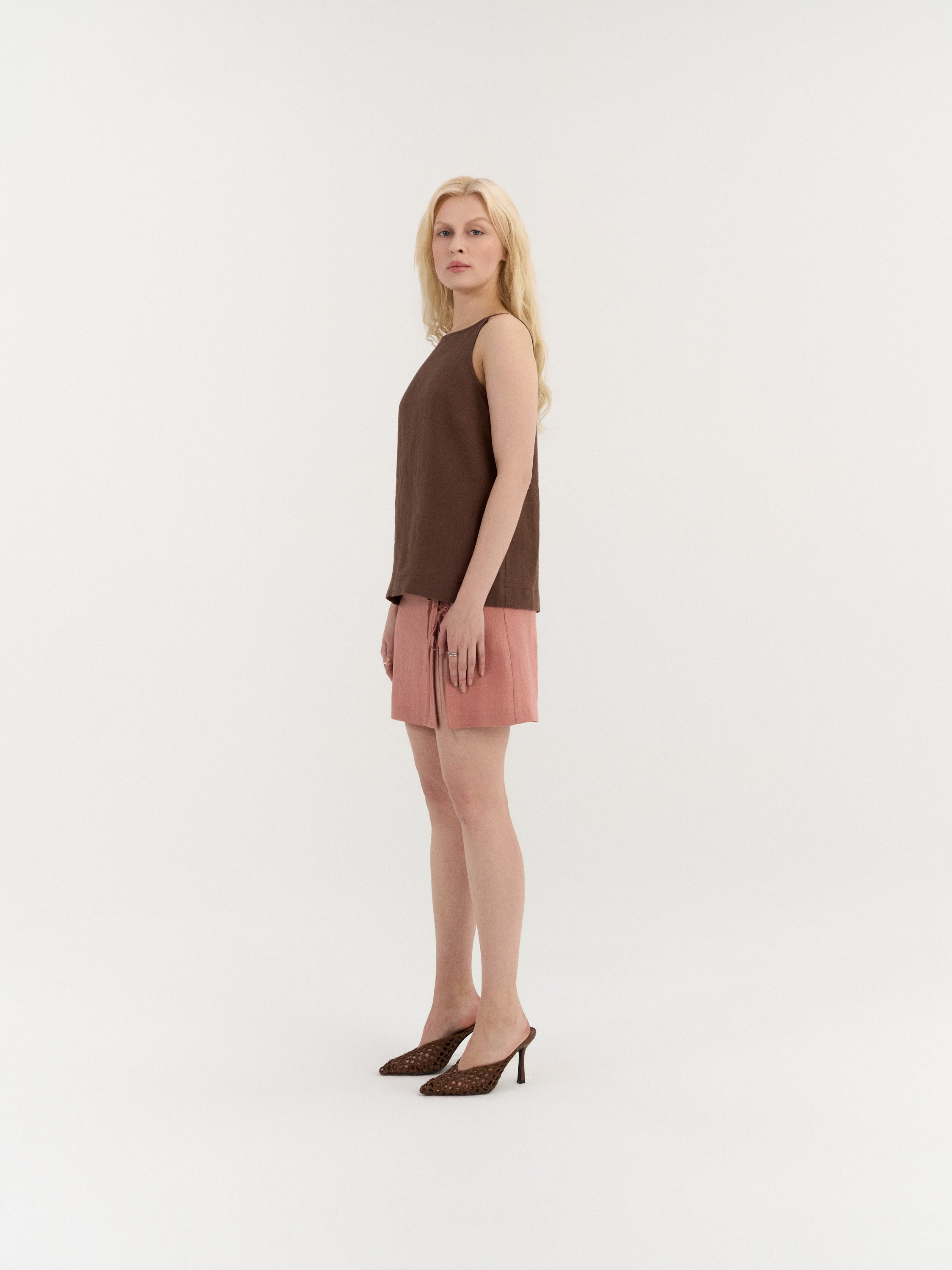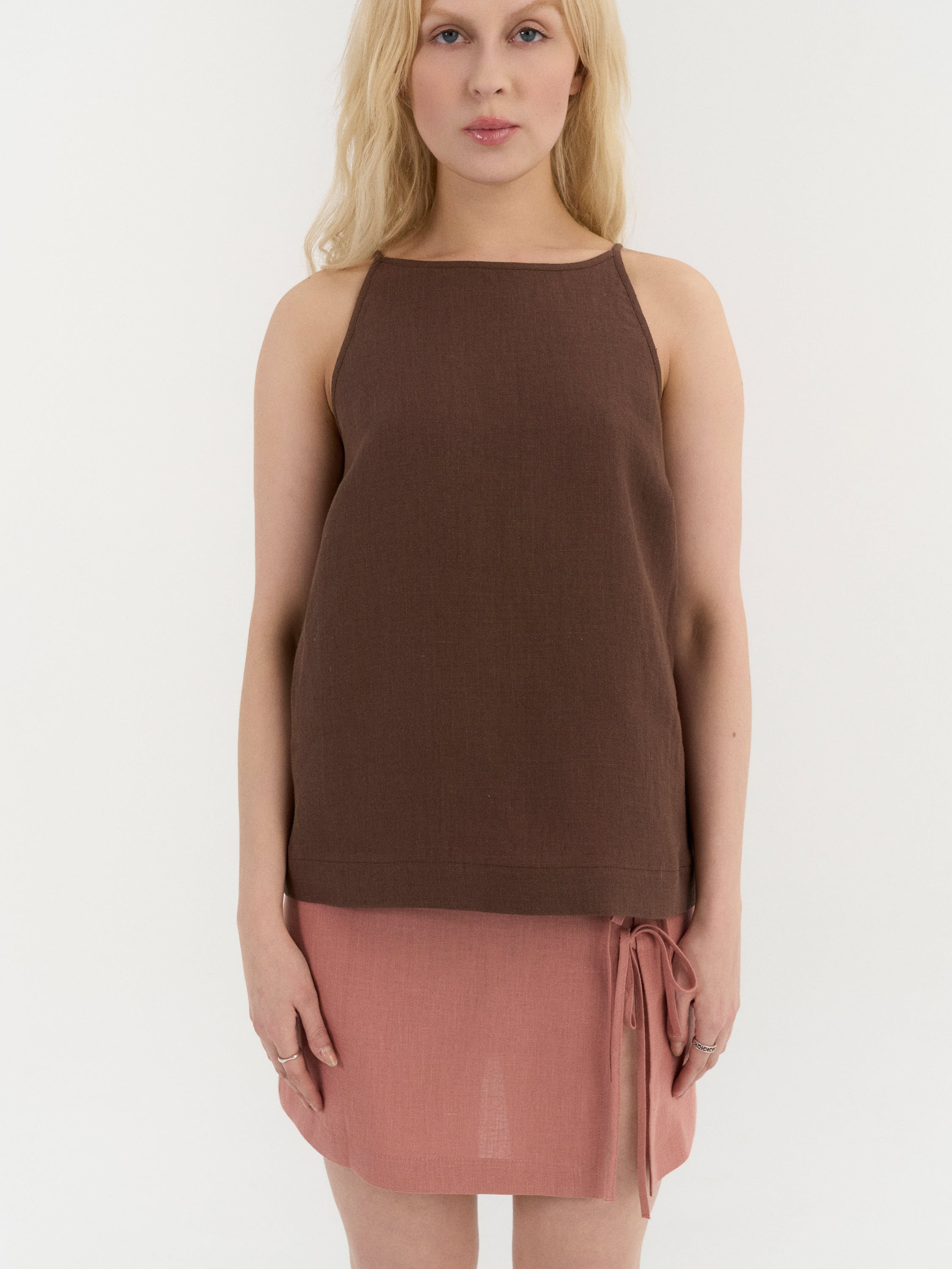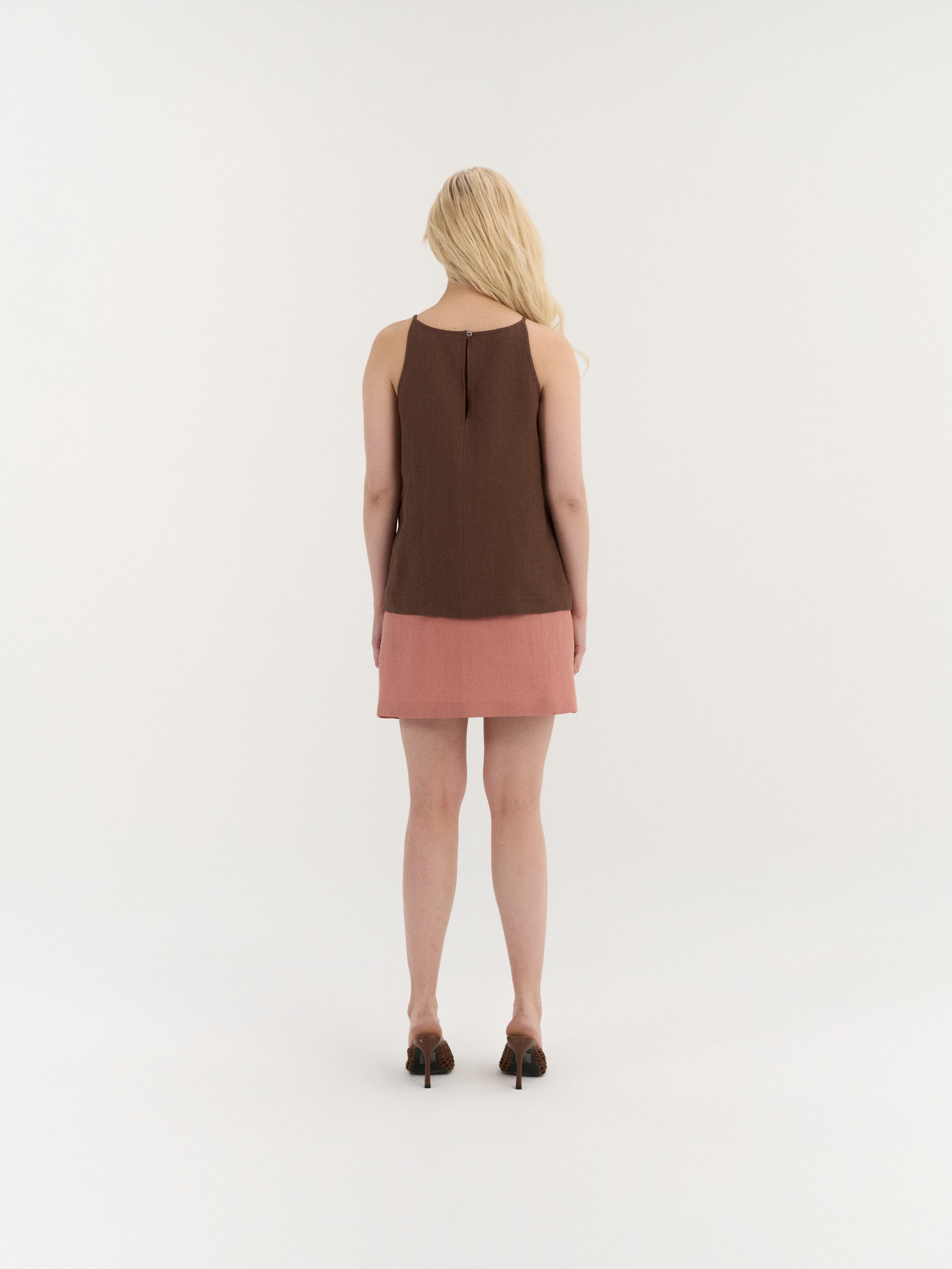 Sleeveless top with a clean, slightly A-line silhouette. The design features a high neckline with narrow shoulder straps and a smooth front. The back is finished with a small button closure and a subtle slit below the neckline. Cut to a relaxed fit with a gently curved hem.
