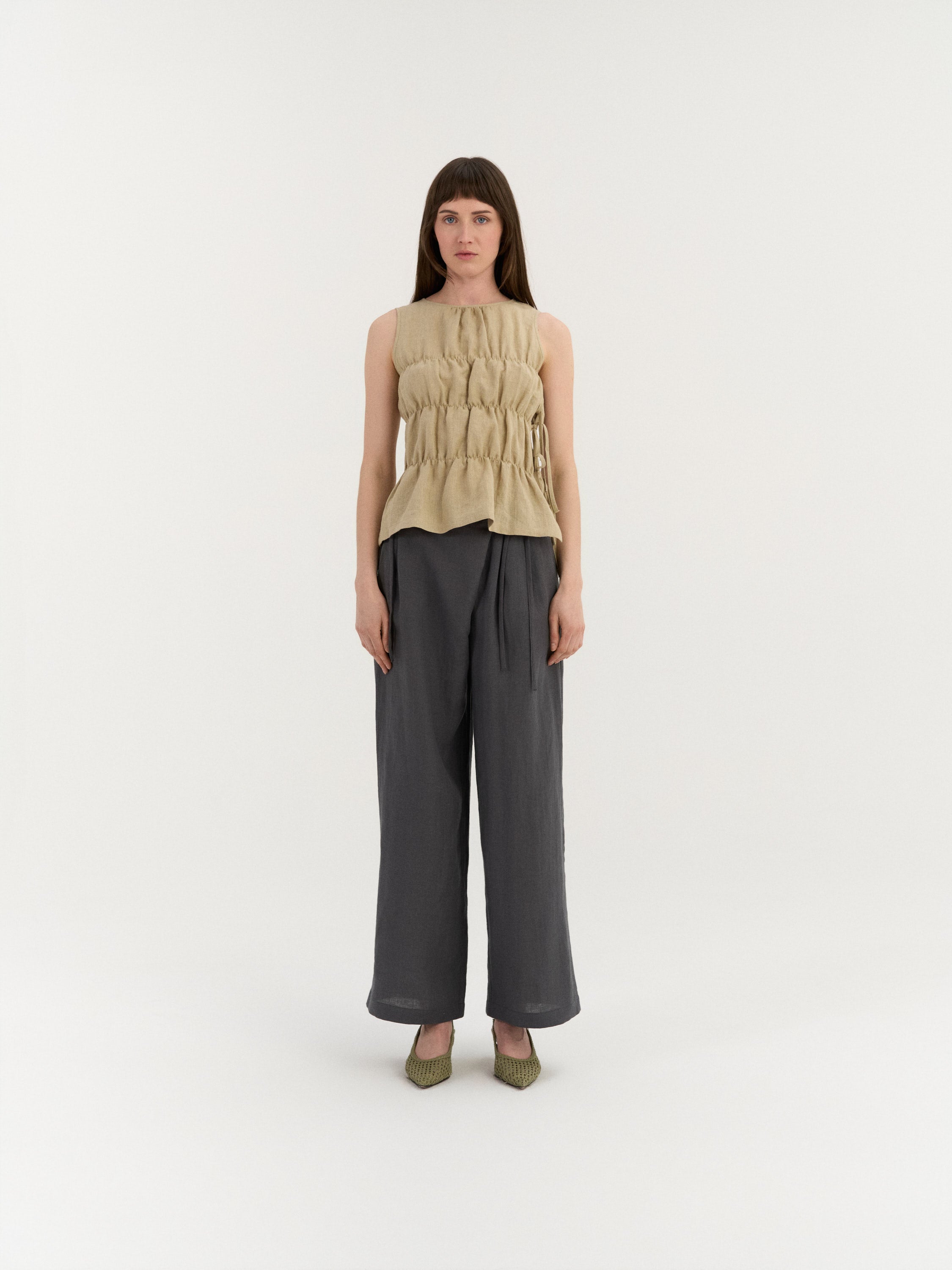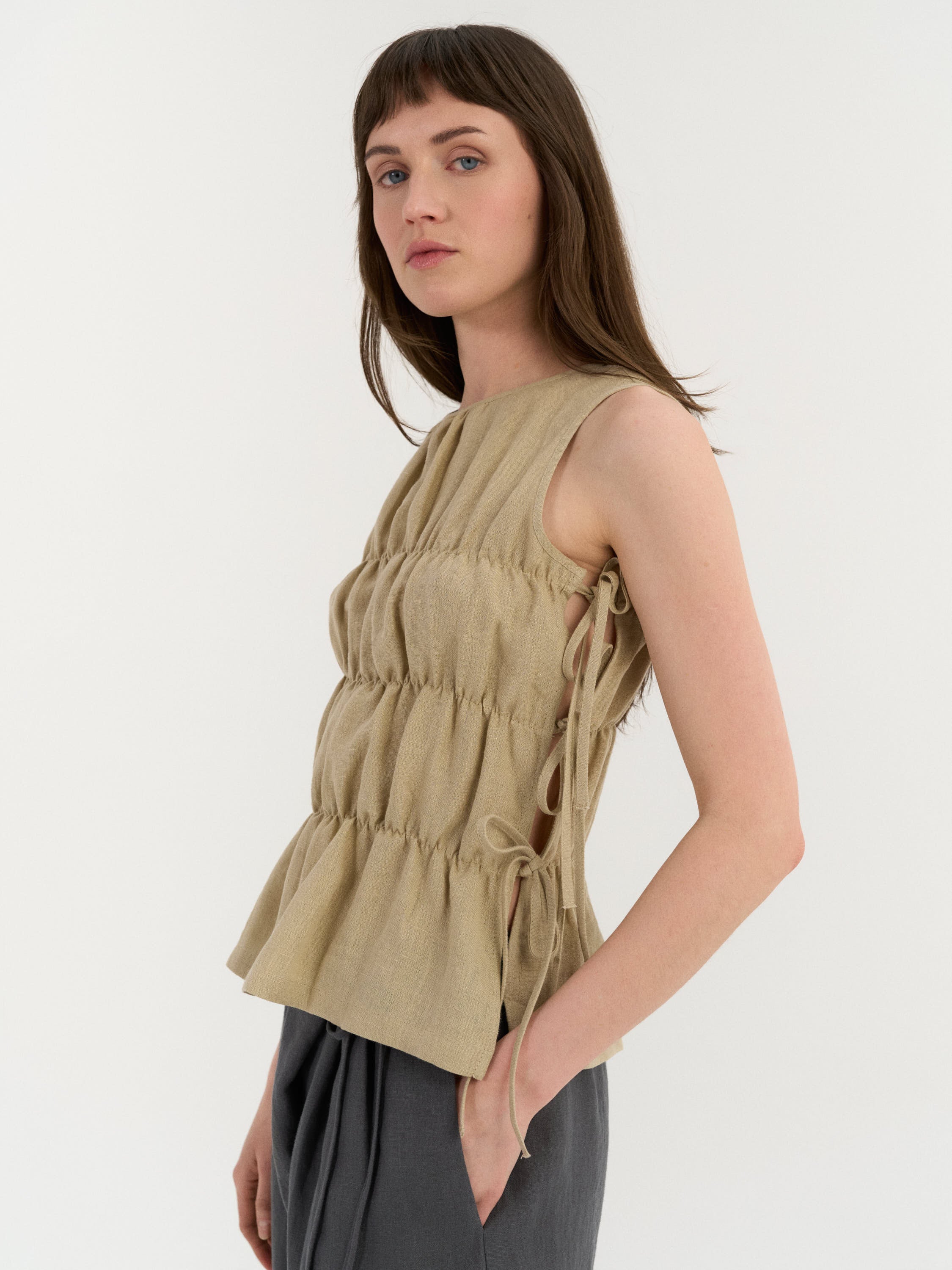 Top sans manches avec un col haut et des panneaux doucement froncés qui créent de la texture et du volume. Les côtés présentent des fermetures à liens réglables permettant de personnaliser l'ajustement tout en ajoutant un détail ouvert et aéré.