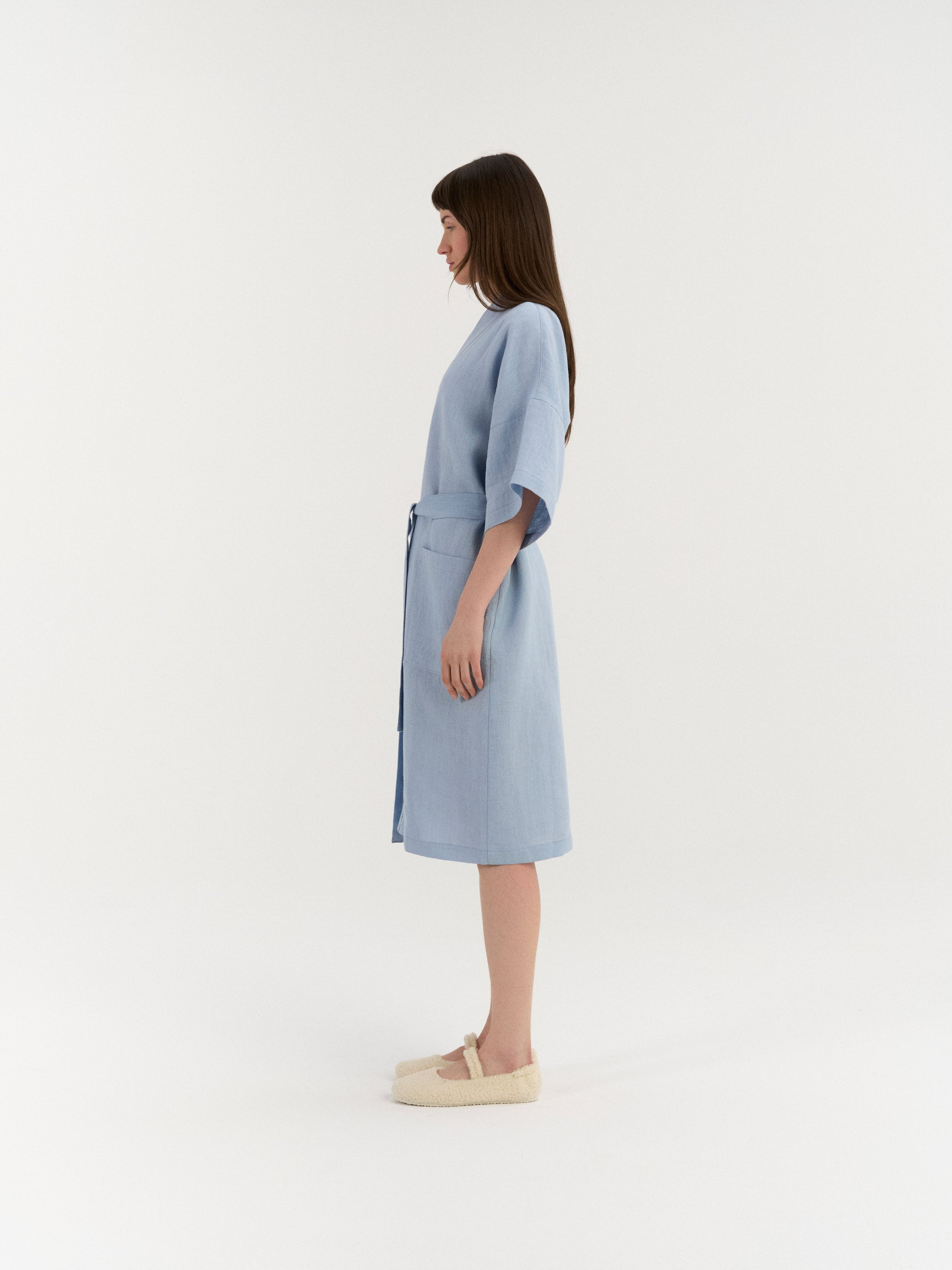 Une robe de chambre, inspirée du kimono. Dotée d'une ceinture classique à nouer et de deux grandes poches avant. Idéale pour se détendre à la maison ou à porter par-dessus un pyjama.