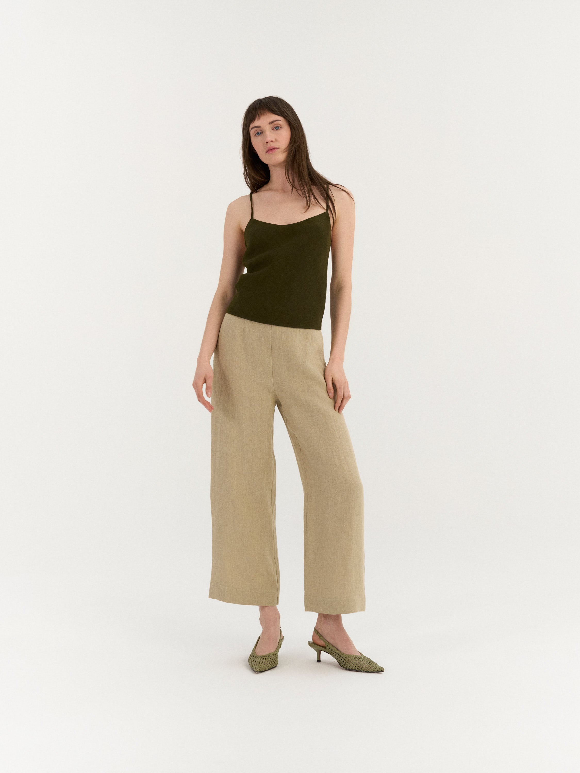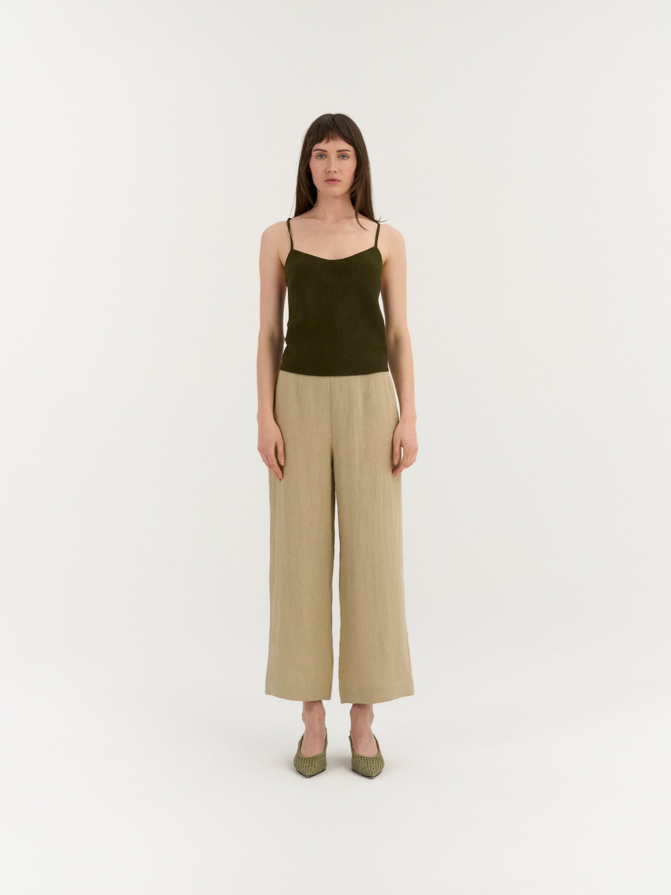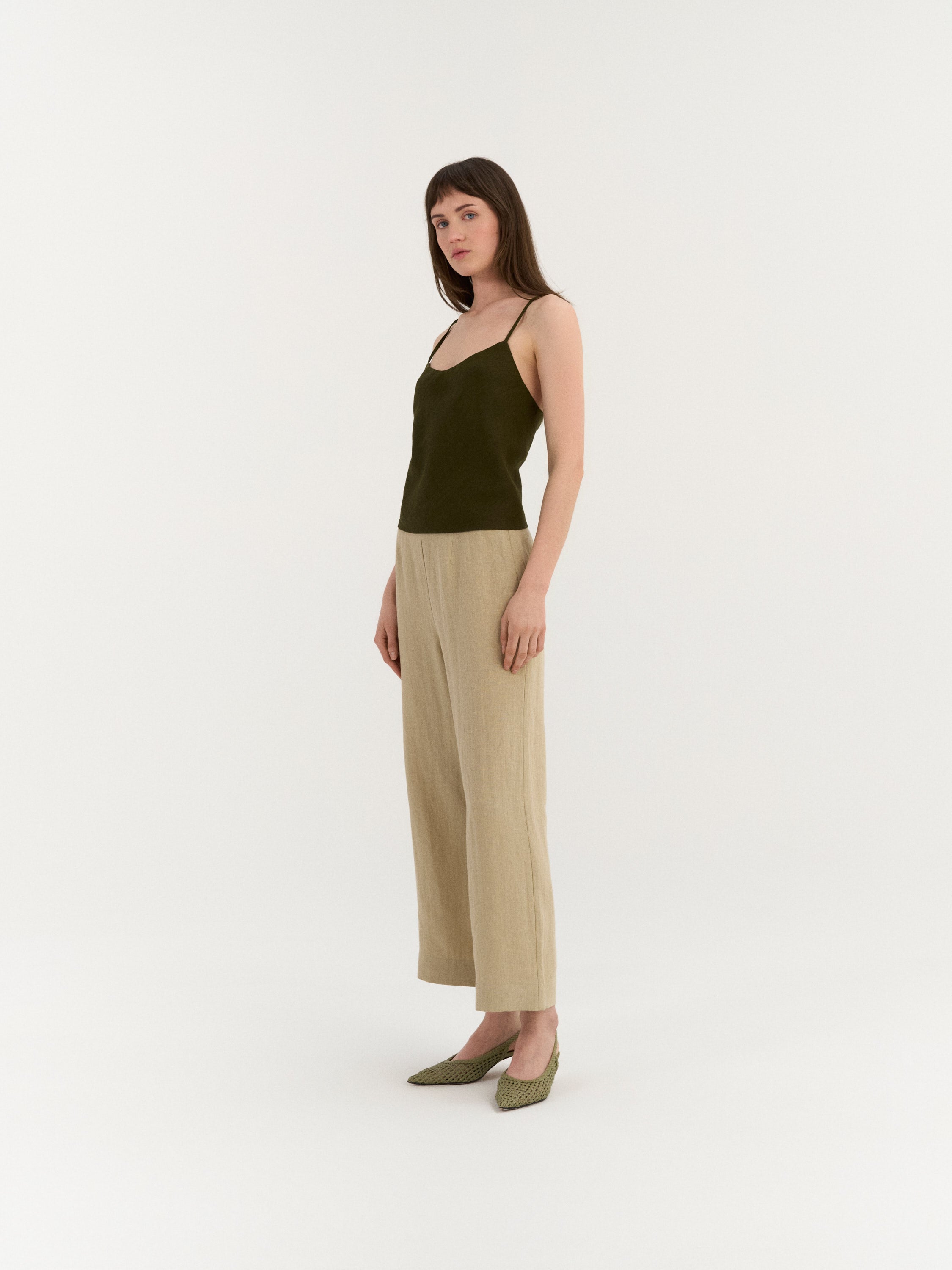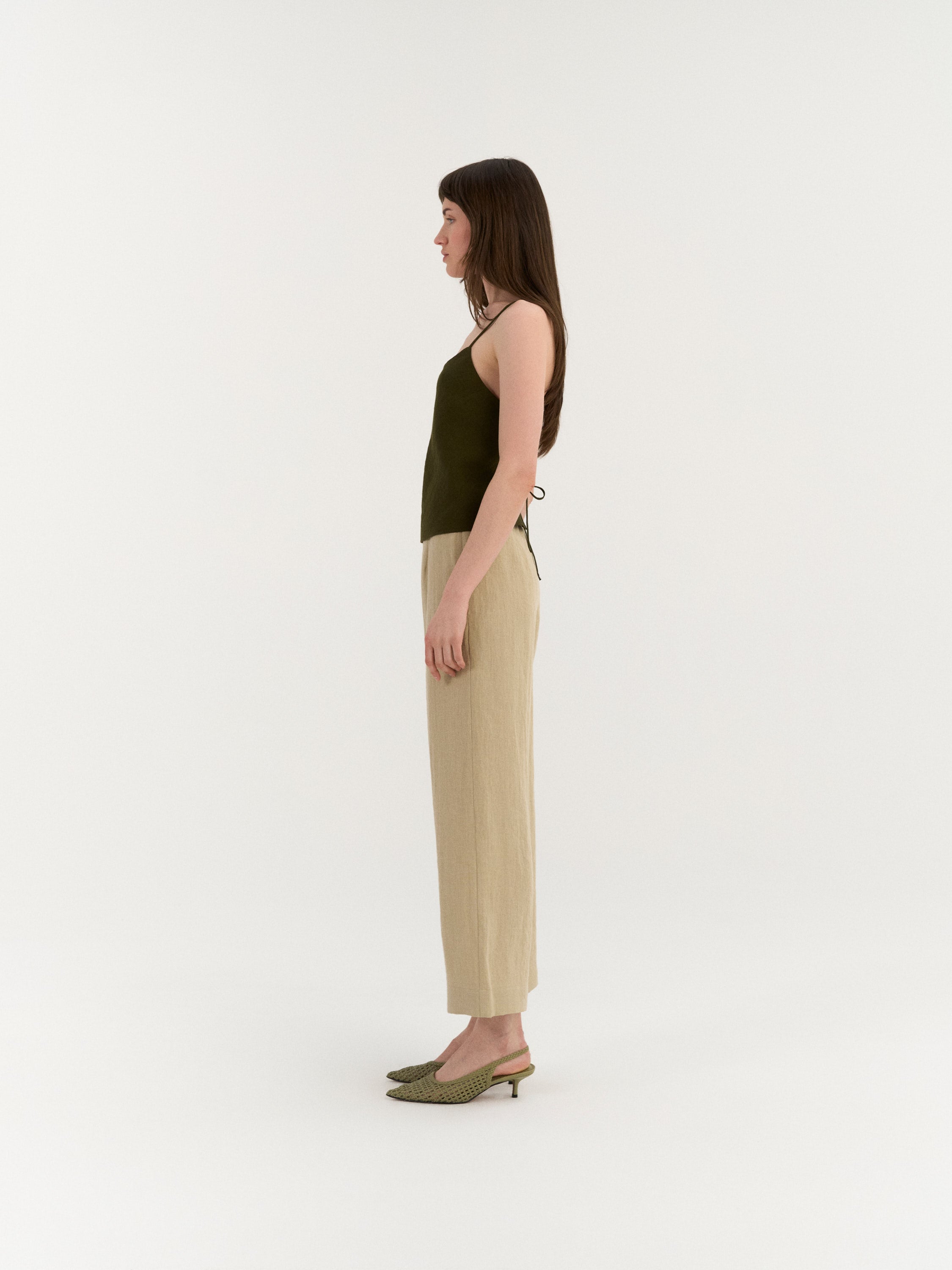 Sleeveless top with a straight neckline and slim shoulder straps. The front features a clean, minimal silhouette, while the back is designed with crossed straps and an open back detail with adjustable lace-up ties. The lace-up closure allows for an adjustable fit at the back. Finished with a straight hem.