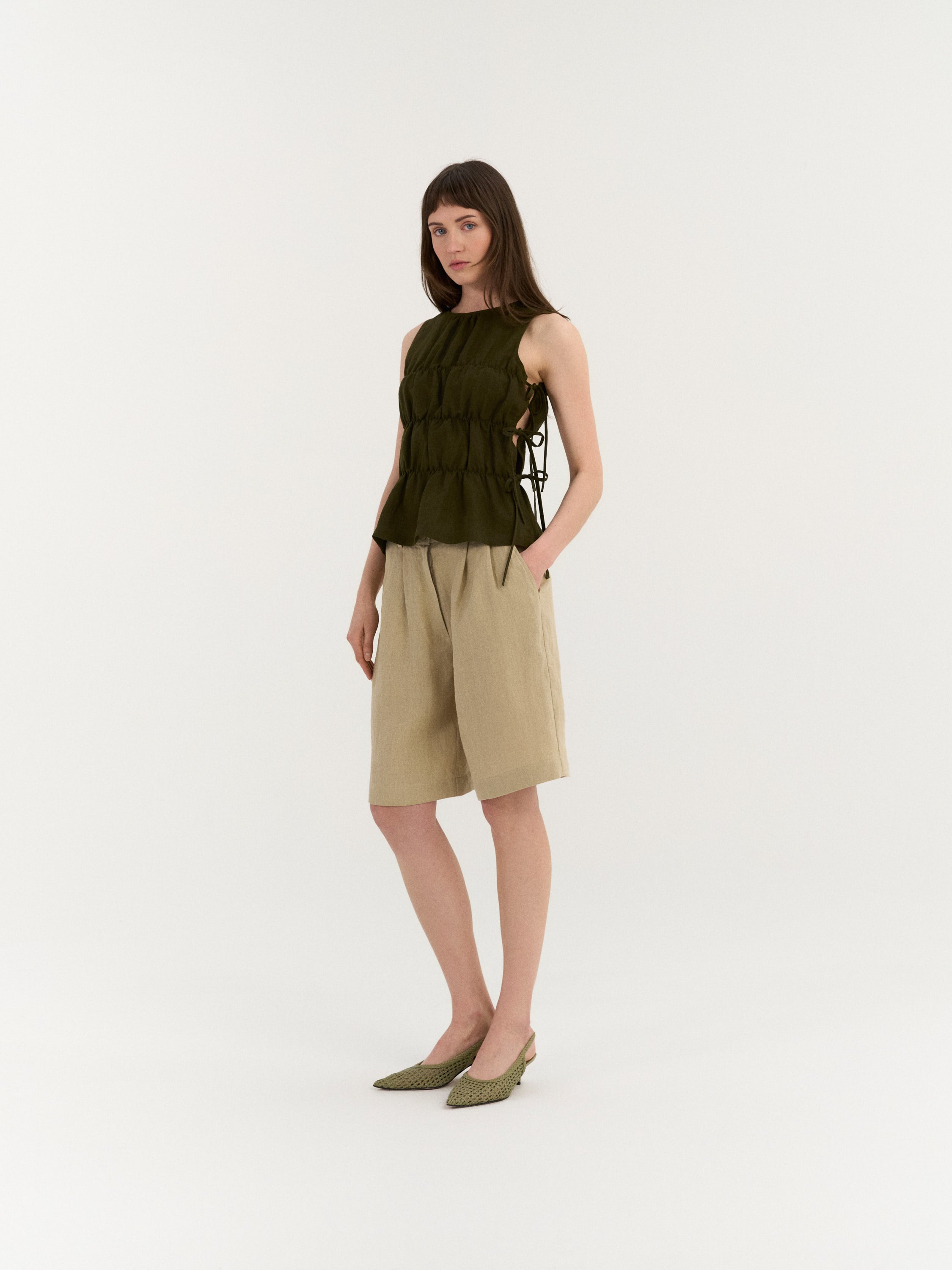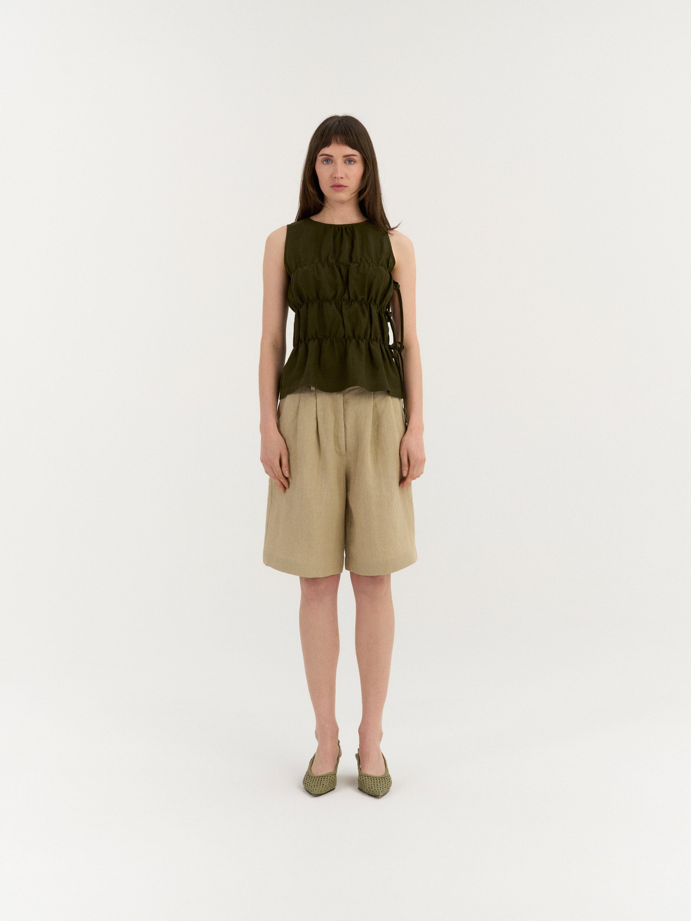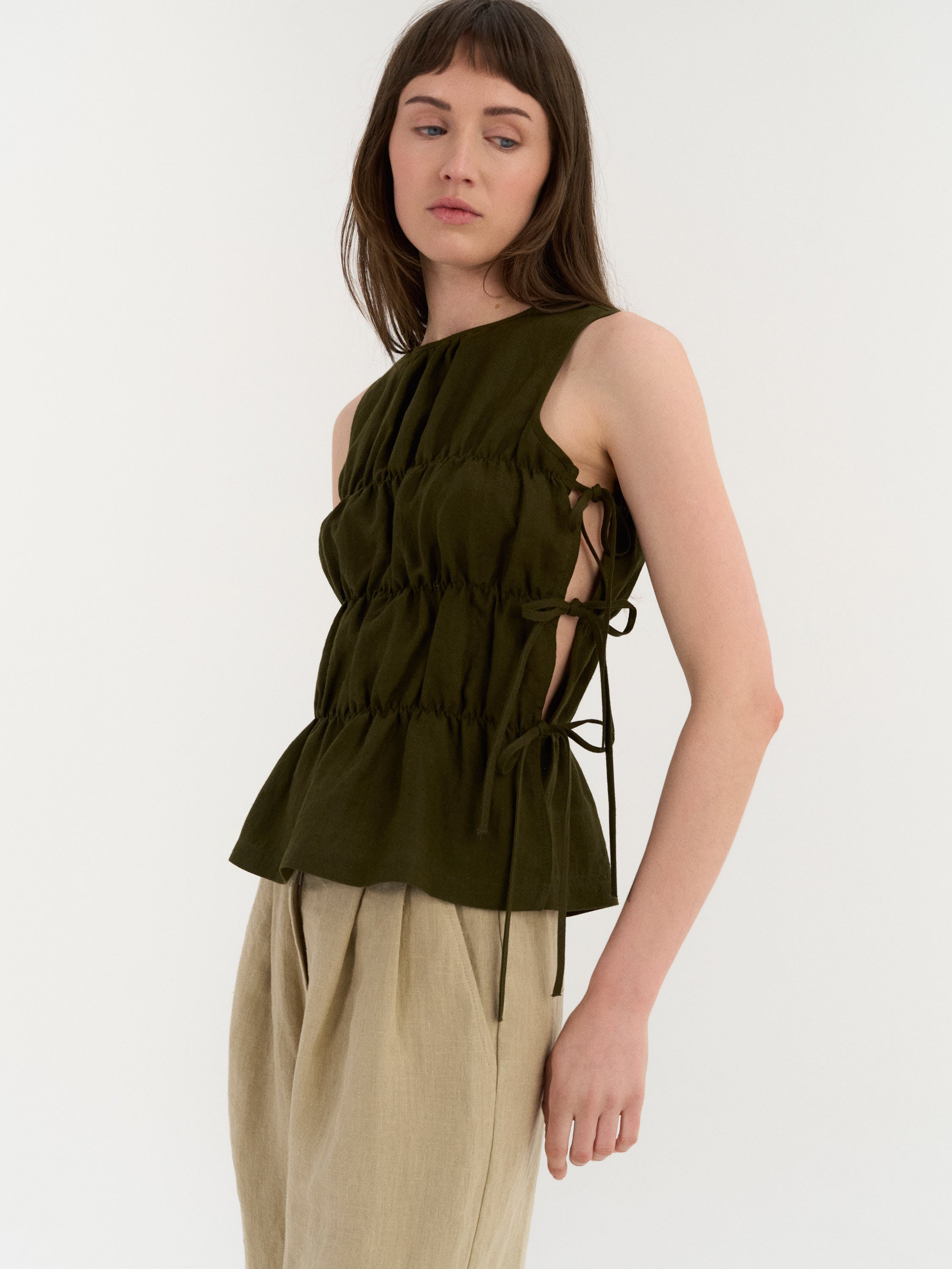 Ärmelloses Top mit einem hohen Ausschnitt und sanft gerafften Paneelen, die Textur und Volumen erzeugen. Die Seiten verfügen über verstellbare Bindebänder, mit denen die Passform angepasst werden kann und ein offenes, luftiges Detail entsteht.