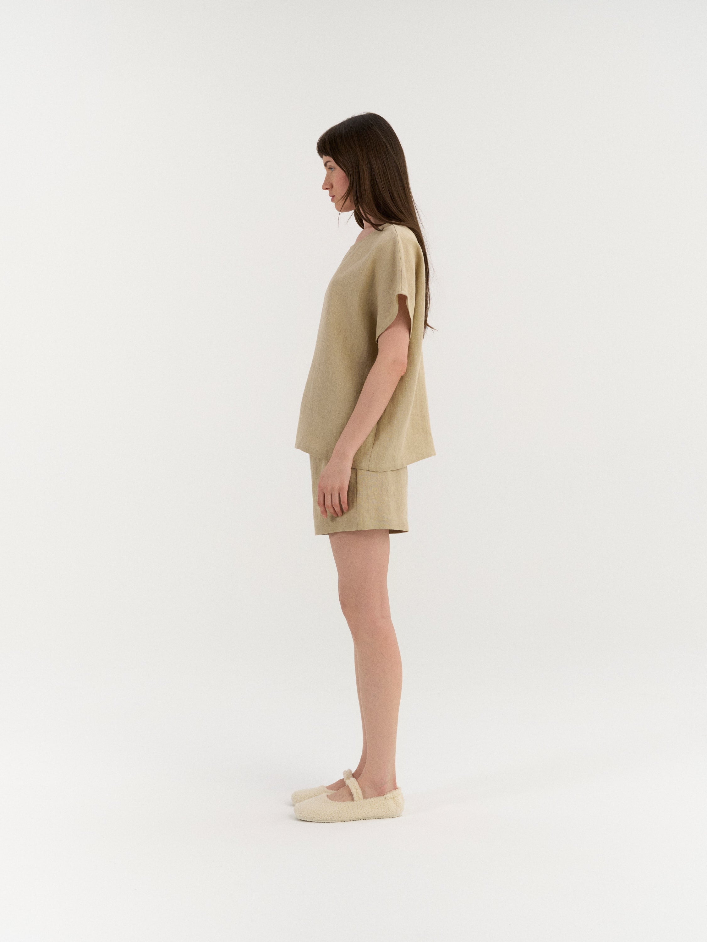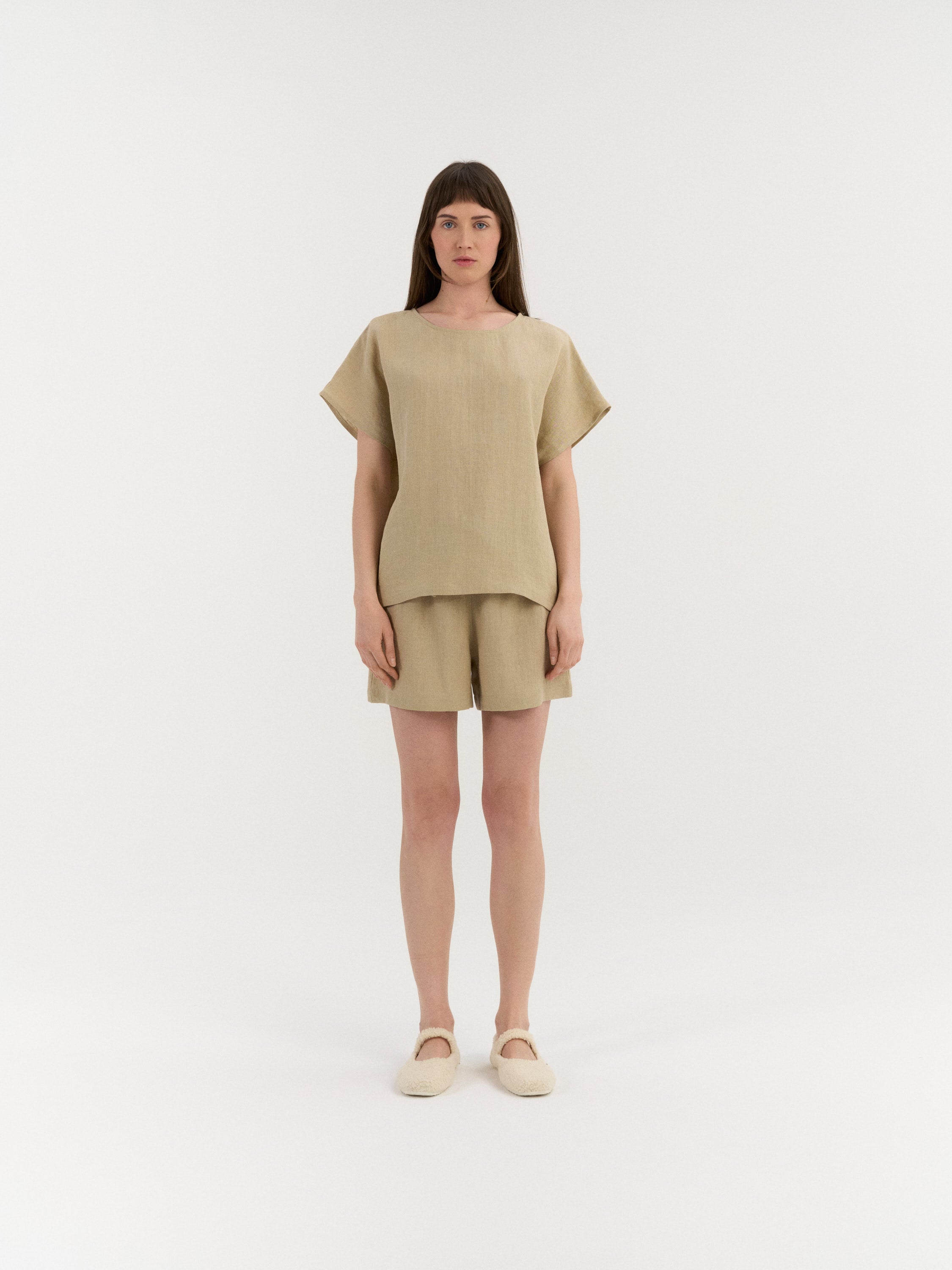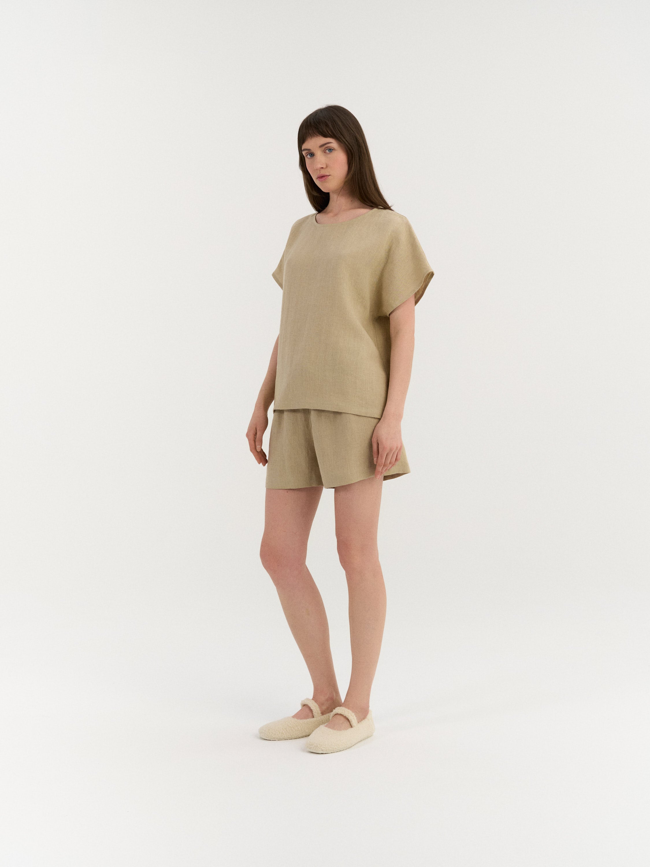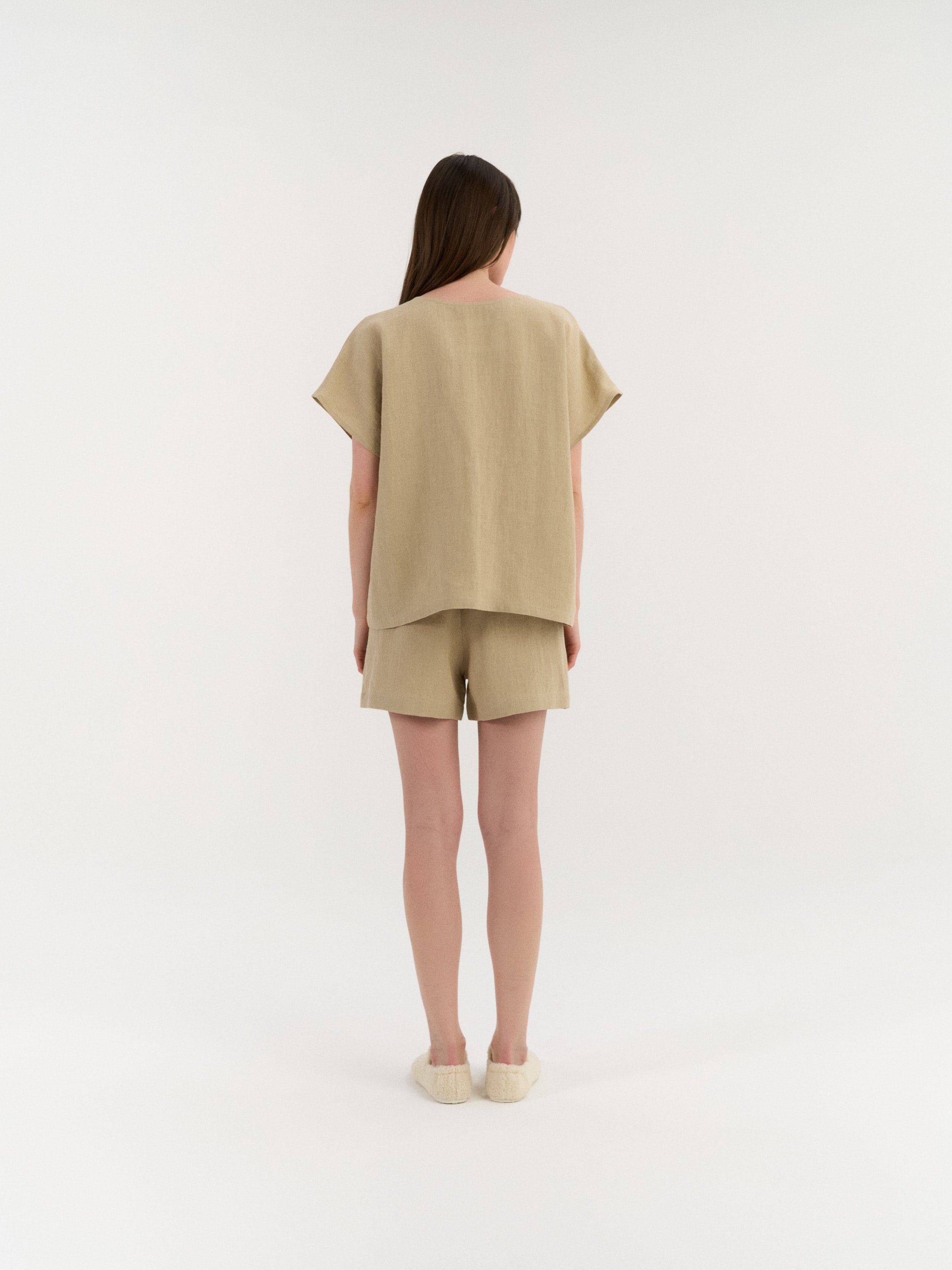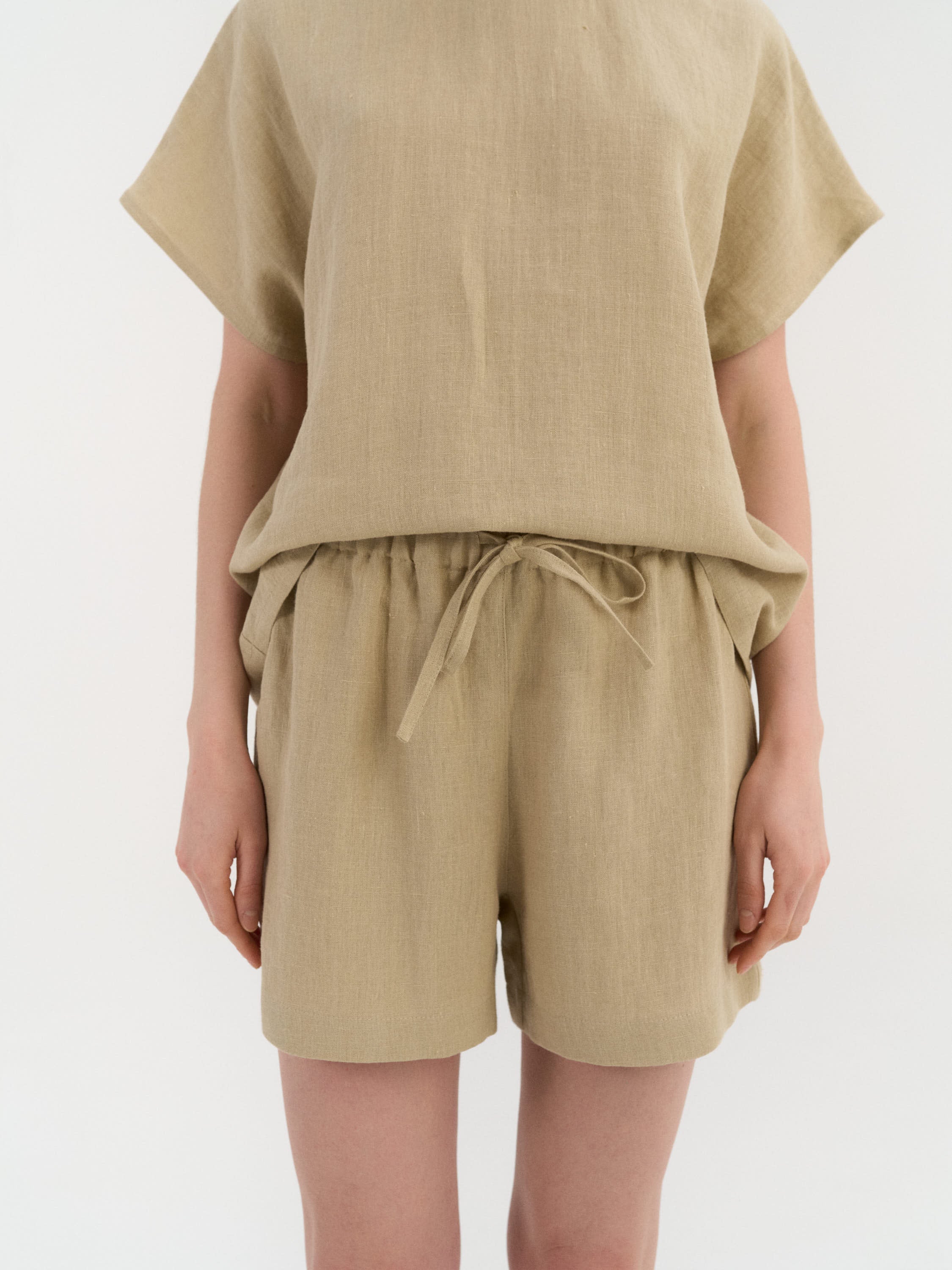Entspanntes Leinen-Pyjama-Set für hohen Komfort. Das Oberteil überzeugt mit klarer, unkomplizierter Silhouette und kurzen Ärmeln, die passenden Shorts sind mit elastischem Bund und verstellbarem Tunnelzug versehen. Ohne Taschen für eine glatte, unkomplizierte Passform.