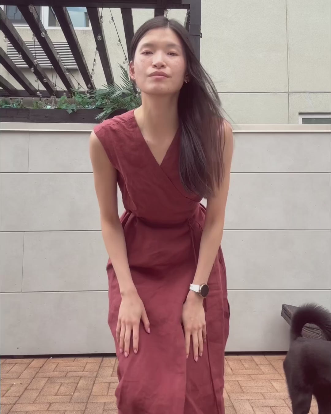 Ärmelloses Midikleid aus Leinen im Wickelstil mit V-Ausschnitt und sanft ausgestellter Silhouette. Der verstellbare Bindegürtel in der Taille, dezente Eingrifftaschen in den Nähten und feine seitliche Schlitze sorgen für Komfort, Bewegungsfreiheit und einen mühelosen Look.