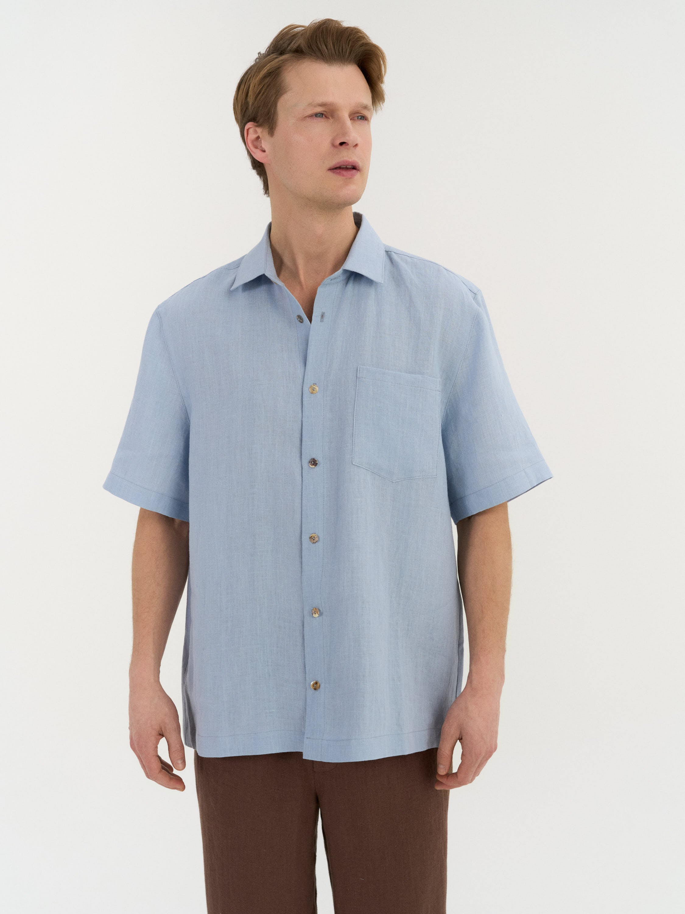 Leinenhemd in entspannter Silhouette mit klassischem Kragen und klaren Linien. Mit natürlichen Muschelknöpfen und einer Brusttasche versehen, bietet es ein weiches Tragegefühl und sanfte Struktur.